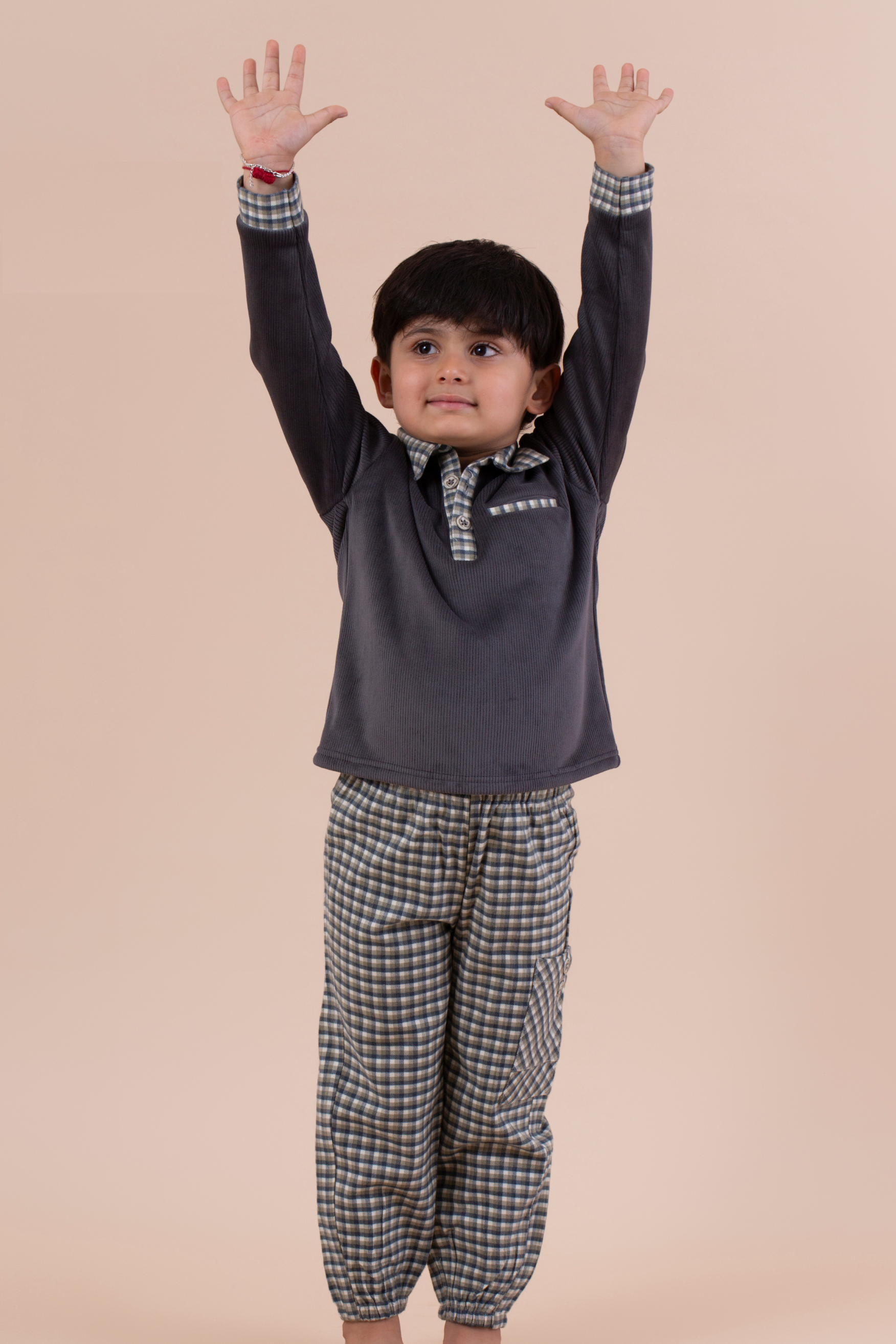 The versatile grey and cream tones of this co-ord set makes it ideal outfit for lounge wear. The collar offers a smart polishes look while the pants provide a relaxed fit with an elastic waist band for comfort.