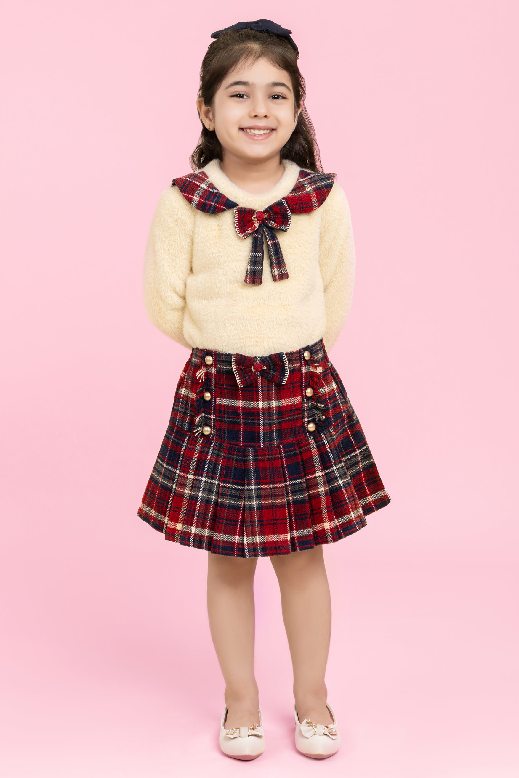 A delightful holiday outfit featuring a soft butter-yellow top paired with a rich maroon checkered skirt.The warm fabric and cheerful colour makes it the perfect ensemble for Christmas celebrations.