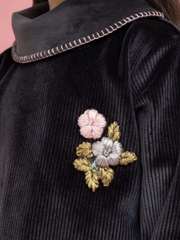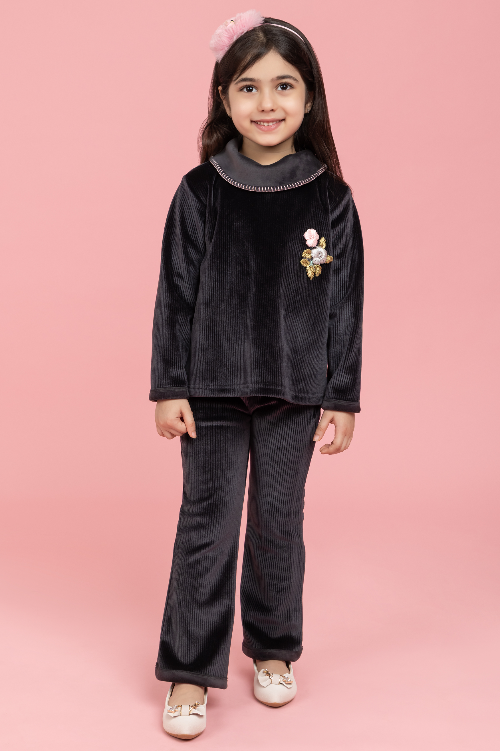 Let your little one shine in style with our dark grey co-ord set, thoughtfully designed for comfort, charm, and everyday play. The highlight of the outfit is the adorable embroidered floral patch and piping that adds a fun, playful touch while keeping the overall look polished and modern. The set includes a matching top and bottom for easy styling and all-day comfort.