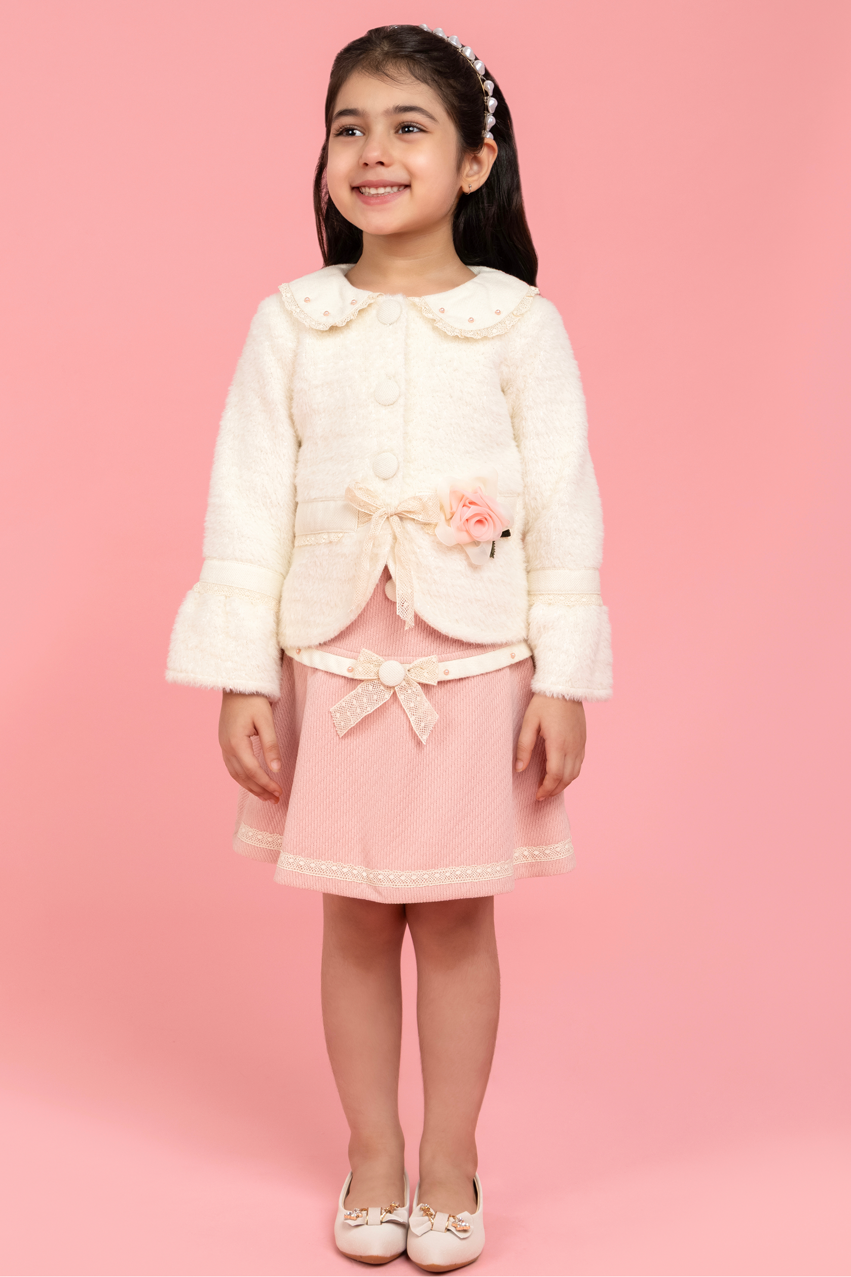 This classic woollen top features a tailored fit with soft wool fabric, providing both sophistication and coziness. Thoughtfully designed with front button closure and subtle detailing, it adds a smart and polished touch to your child’s look.Paired with a light pink flared skirt, made from soft and breathable fabric, the set strikes a perfect balance between graceful design and playful charm