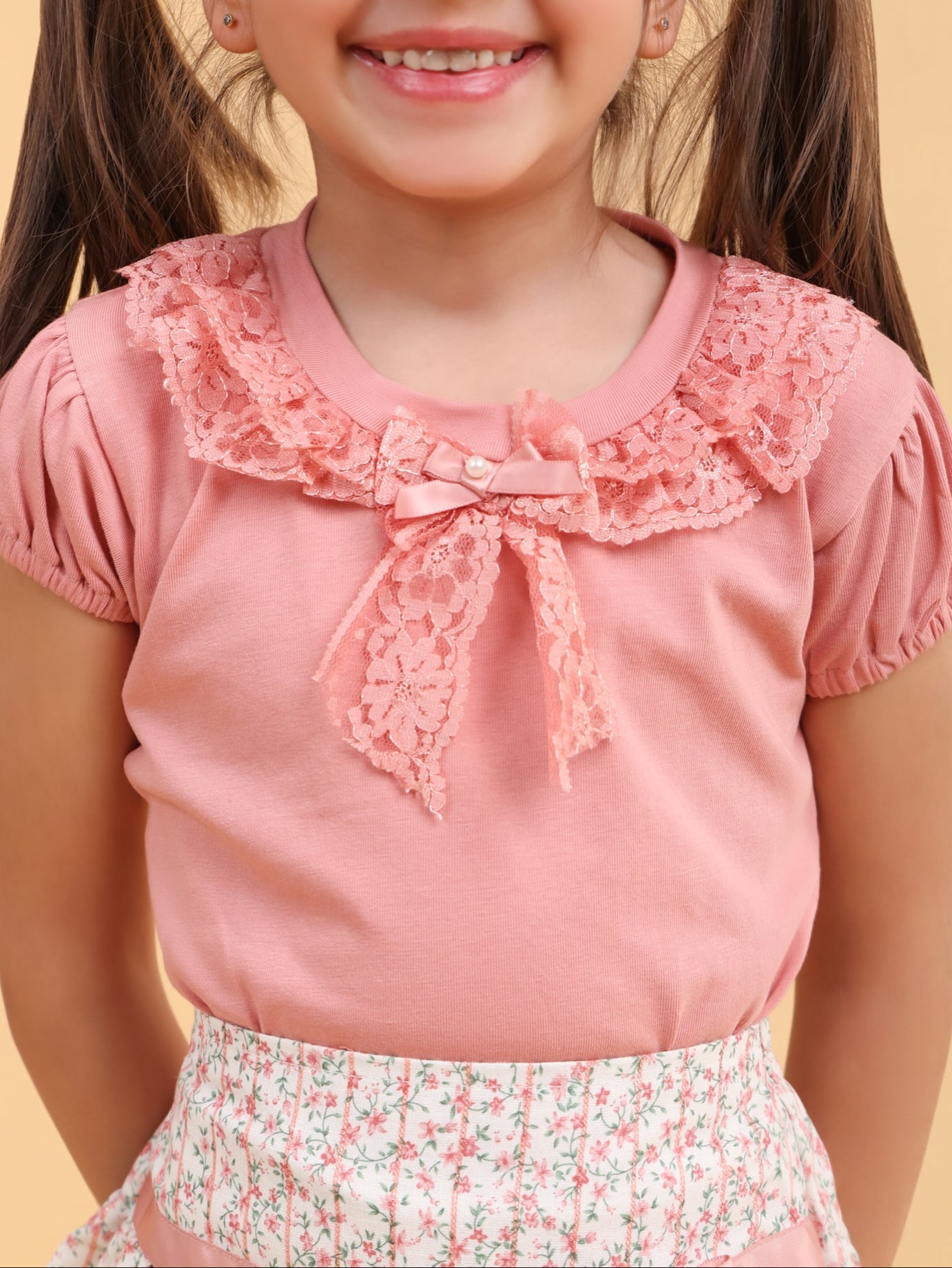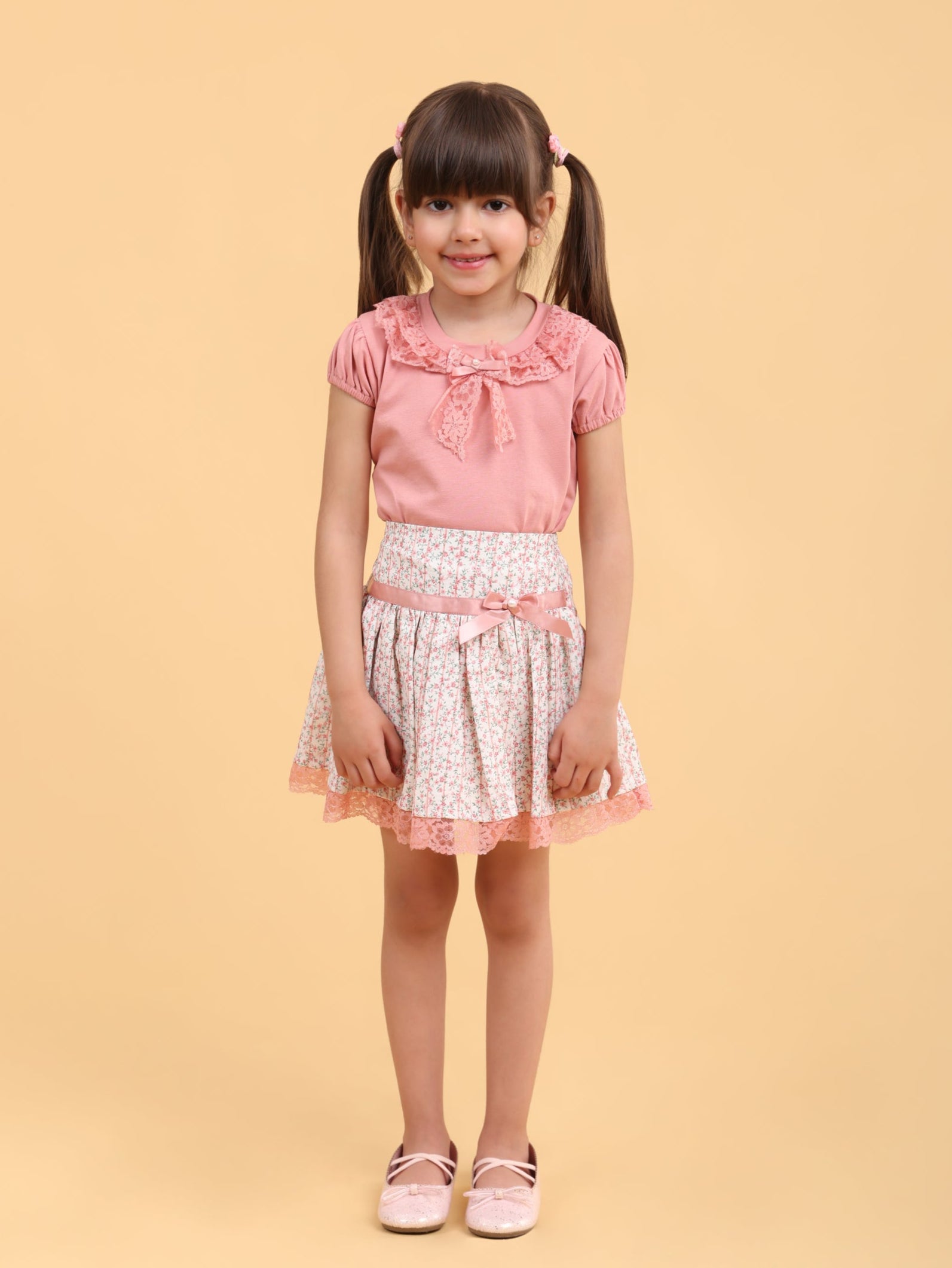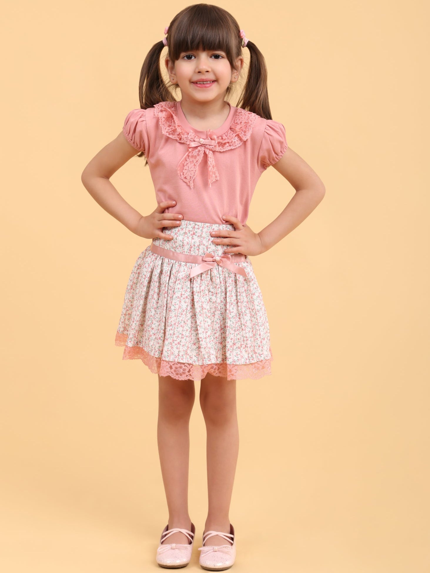 Dress your little one in timeless elegance with our peach lace top and floral flowy skirt. A perfect blend of style and comfort.