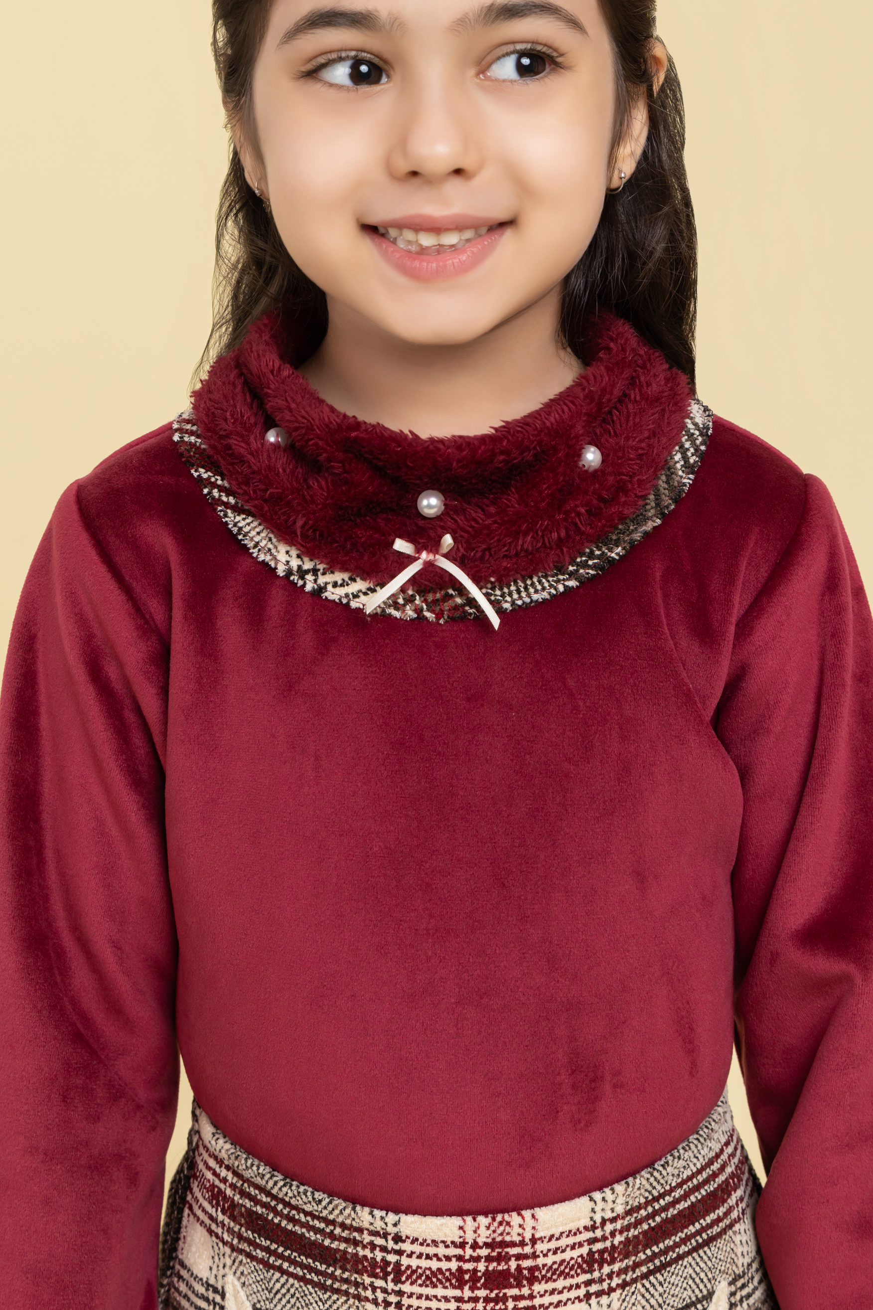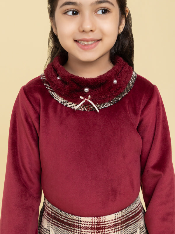 Classic charm meets playful comfort in this adorable skirt set .The rich maroon top paired with a stylish grey checkered skirt , this outfit strikes the perfect balance between trendy and timeless.